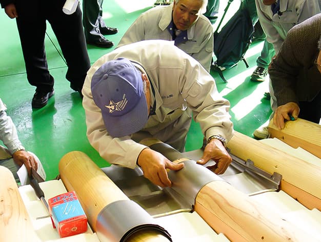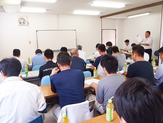 (技術研修・安全衛生研修・製品研修) - 職人の垣根を越えた技術研修で工事品質の向上を目指し、さらに座学での法令研修や現場での課題を意見共有して改善に努めています。また、講師を招いての安全衛生研修なども実施しております。