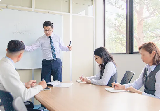 配属先で支店長や先輩社員に同行し、実際の業務に携わりながら、仕事に必要な知識やスキルを習得する。実践と座学を反復しながら基礎知識を学びます。
