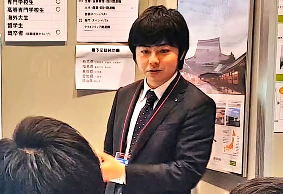 企業を選ぶ際に「やりがいのある仕事」「人に誇れる仕事」ができる会社に入りたいと思っていました。そこで就活サイトで色々な企業を調べている時、建築業をしているカナメの存在を知りました。もともと大学では地理学を学んでおり、建築に関する知識は皆無だったのですが、カナメには寺社事業部という部署があり、ここなら私の求めている「やりがいのある仕事」「人に誇れる仕事」ができると思い、説明会に参加しました。