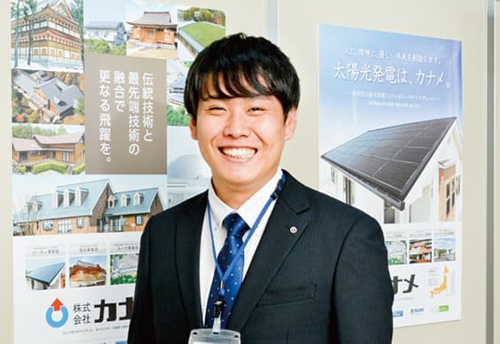 学生時代は、会計学を学んでいましたが、合同説明会でたまたまカナメのブースを通りかかった時に、浅草寺の写真があって、なんだろうってすごく気になったんです。自分が浅草寺に数ヶ月前に行っていたこともあって、この会社は何をしている会社なんだろうと相当気になりました。それからカナメがどんな会社か調べていくうちに、金融しか興味なかった自分に、新しい視野を与えてくれたのがカナメです。もともと営業をやりたかったのと、学生時代に販売員のアルバイトをしていた経験から、物を売ることに興味がありました。カナメは屋根材を開発から行っているので、お客さんの要望に応えられるものを自分たちで作り、販売できることに魅力を感じました。